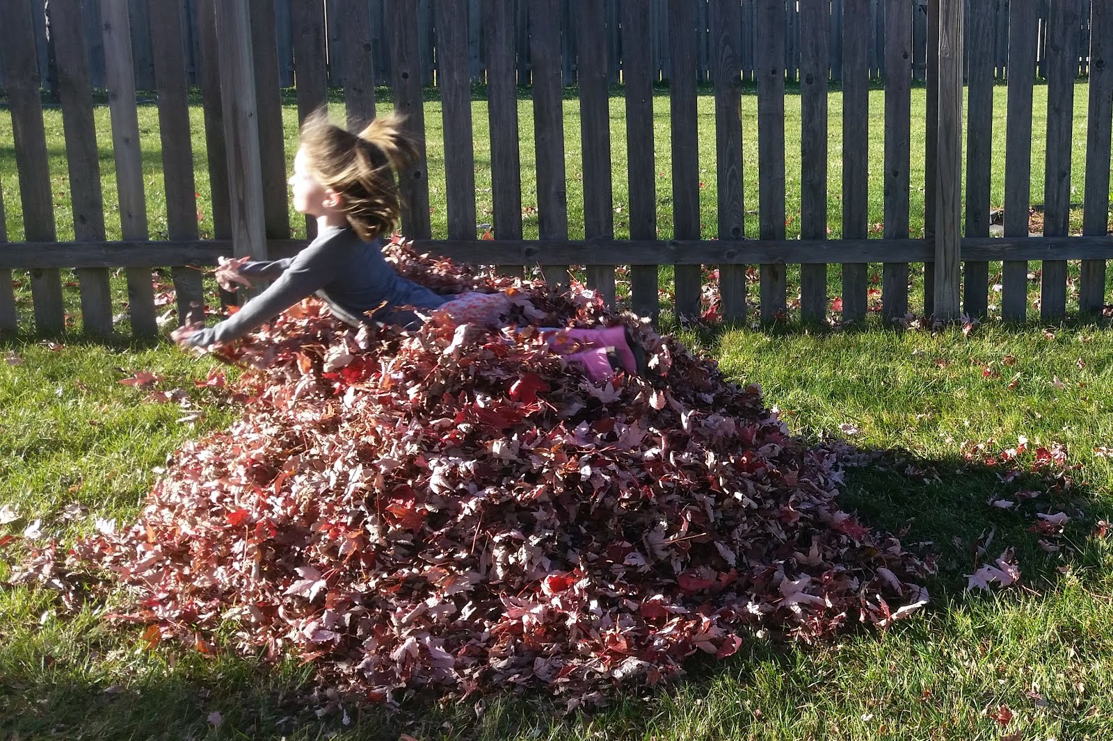 I decided today was a good day to rake leaves, and because I'm not a terrible parent, I invited the kids to come outside to do one of the best fall activities: jumping in leaves. I raked them into a giant pile, and then had all the kids jump in the pile, with varying techniques and varying results. Joshua started far away, and in a dead sprint headed toward the pile, launching from a distance and crashing right into the middle of the pile. That was expert technique.